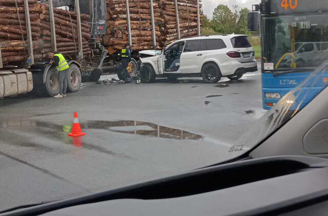 Susidūrė krovinį vežęs miškavežis ir lengvasis automobilis „Mercedes-Benz".