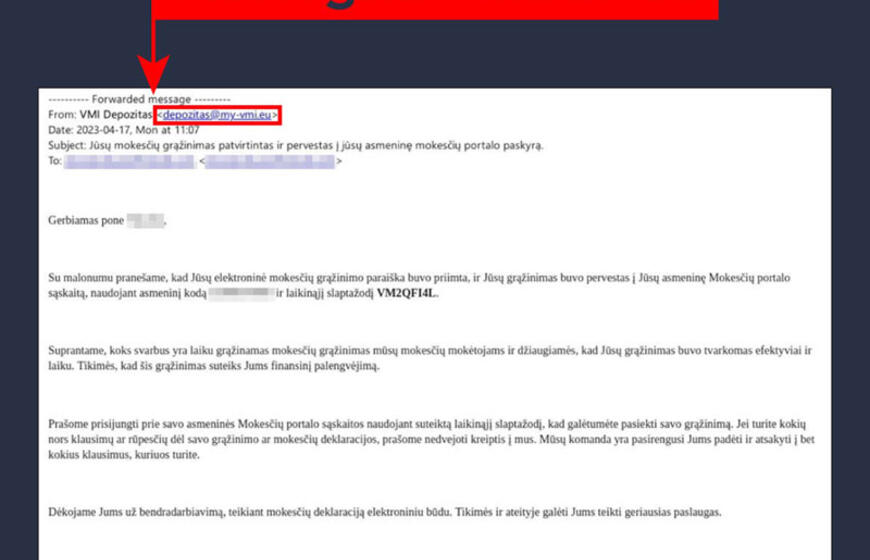 APGAULĖ. VMI oficiali svetainė, iš kurios galima tiesiogiai prisijungti prie VMI informacinių sistemų, yra www.vmi.lt. Jei nuoroda baigiasi .net, .com, .info, .org, .biz, .eu - tai sukčiai. Taip pat jeigu po panašios į VMI nuorodos yra brūkšnys „-“ (pvz.: vmi.lt-koks_nors_tekstas) - tai irgi nusikaltėliai.