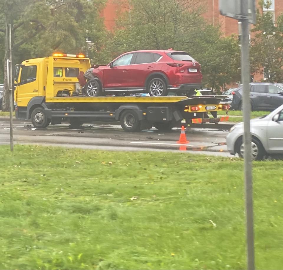 Apie 11.46 val. lietaus nuplautoje Liepojos gatvės pradžioje, ties vasaros estrada, susidūrė tą pačia kryptimi važiavęs vilkikas ir "Mazda" - lengvasis automobilis rėžėsi į sunkvežimio galą.
