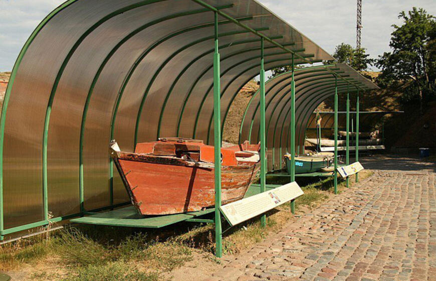 EKSPOZICIJA. Gintaro Paulionio, perplaukusios Baltijos jūrą, išlikusi dorės „Alfred Jensen“ dalis. Šalia jos yra ir trivietė irklinė kanoja „Baltoscandia“, kuria 1999 m. vasarą irgi buvo perplaukta Baltijos jūra.