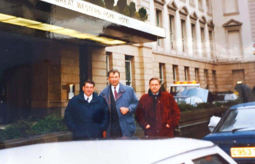 LONDONE. Iš kairė: Rimantas Dargis, Benediktas Petrauskas ir Aloyzas Vilkas 1993 m. Londone ieško būdų, kaip prikviesti regatą į Klaipėdą.