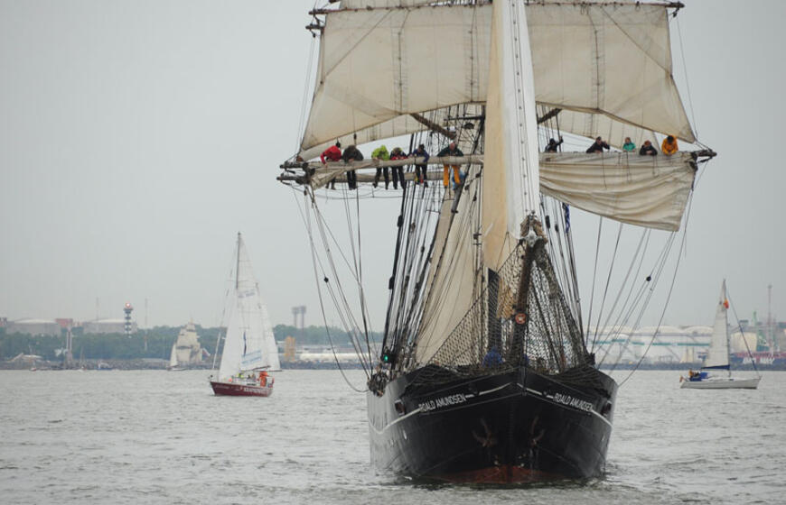 BURĖS. Klaipėdoje viešėjęs burlaivis „Roald Admundsen“.