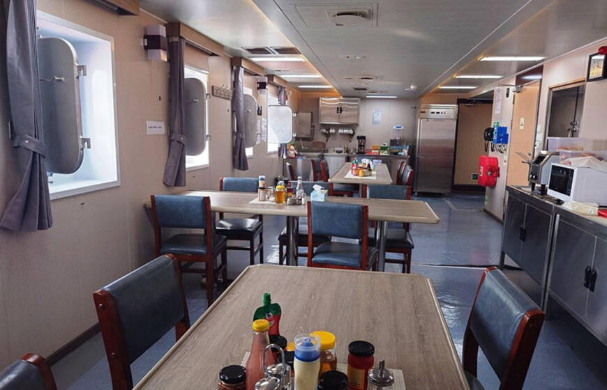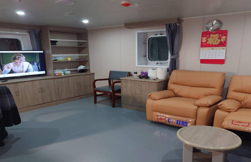 Dalis kapitono kajutės, kuri yra trijų kambarių buto dydžio.