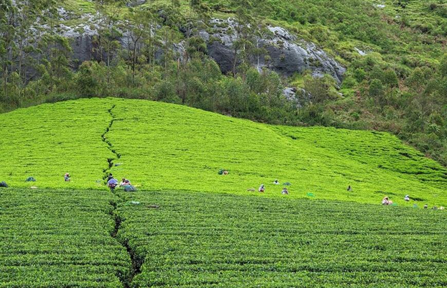 © Žmonės renka arbatos lapus. Tamsiai žalia - jau nurinkta.
