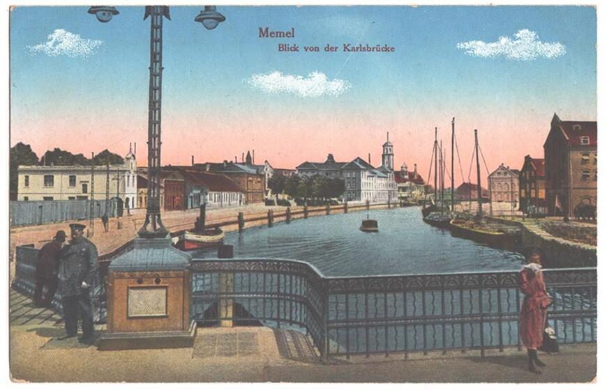 Prūsijos karaliaus Friedricho Wilhelmo III sūnaus Karolio vardu pavadintas tiltas (1921 m. atvirukas), kurio vietoje dabar stovi Pilies tiltas. Deniso NIKITENKOS kolekcija.