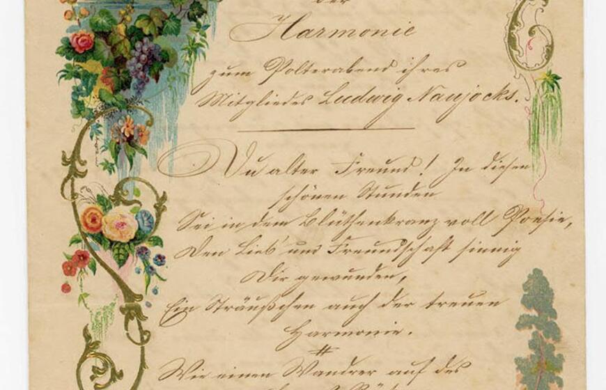 © Sveikinimas Liudwigui Naujoks bernvakario proga nuo muzikų sąjungos „Harmonie“. KLAVB, AdM archyvo nuotr.