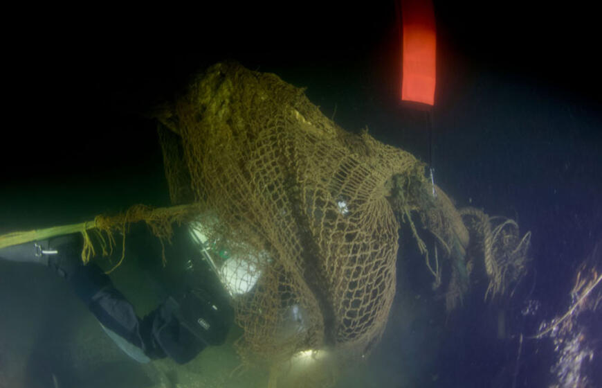 © KENKIA. Nuskendę žvejų tinklai kenkia aplinkai.