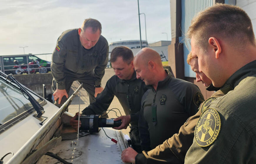 © MOKO. Pakrančių apsaugos pasienio rinktinės vyriausiasis laivavedys Mindaugas Markevičius (antras iš kairės) veda darbo laive ant oro pagalvės mokymus.