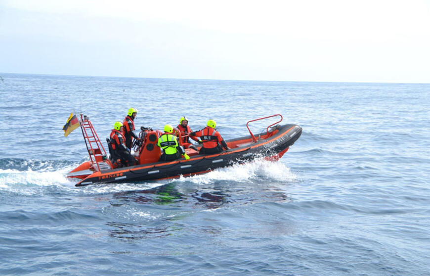 © PAREIGŪNAI. Kontrolės pareigūnai plukdomi į žvejybos laivą. Žuvininkystės kontrolės departamento nuotr.