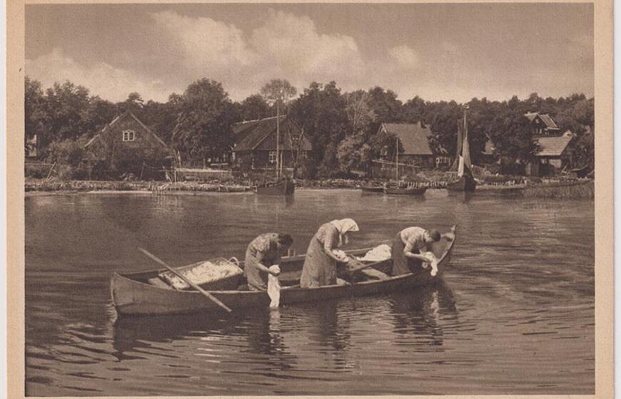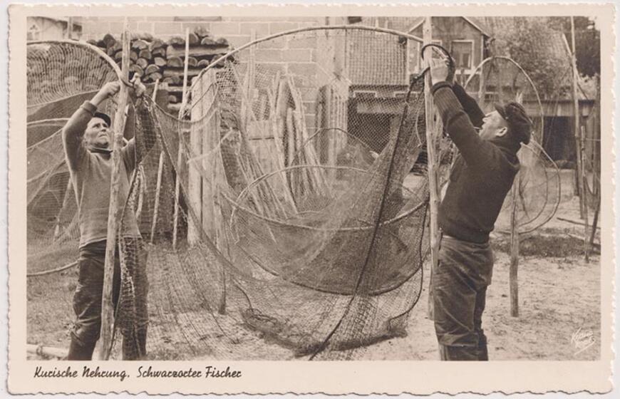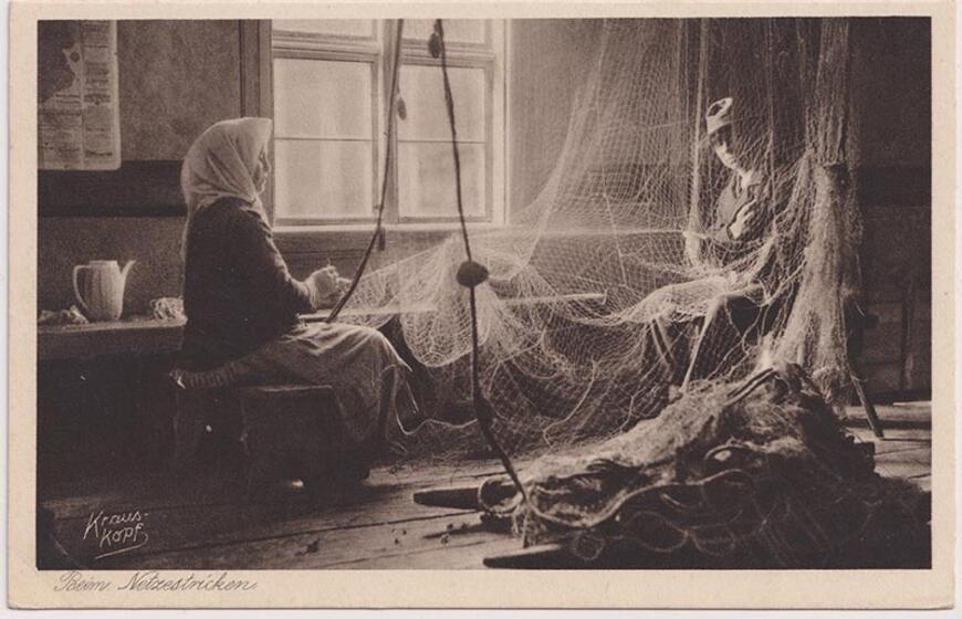 Kuršininkė taiso tinklus. Žvejyba ir kurortinės epochos aukso amžiuje tebebuvo pagrindinis nerijos gyventojų amatas. XX a. 4 deš. Deniso NIKITENKOS kolekcija.
