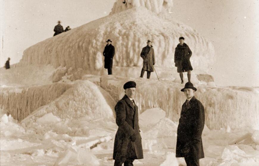 © Tarsi prie kalėdinės eglutės. Apledėjęs švyturys buvo puiki vieta įsiamžinti. 1929 m. nuotrauka. Eric CHEATWOOD asmeninis archyvas.