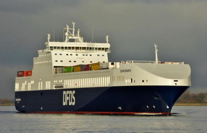 © LAIVAS. „Tulipa Seaways“ yra 210 metrų ilgio. Jis gali gabenti 262 priekabas, kurios išrikiuotos į vieną eilę sudarytų 4076 linijinius metrus.