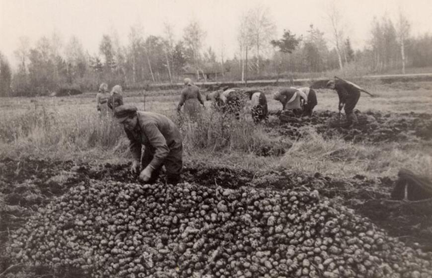 © Bulves kasa Vabalų ir Aukštumalės gyventojai: Herta Kramp, Hilda Strangalies, Skurdelis, Ona ir Domas Gusčiai, Joana Balnienė. Buvo kalbama, kad tas bulves išveždavo į Rusiją. Asmeninio albumo nuotr.