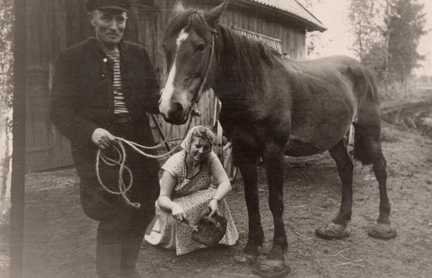 © Arkliui dedamos klumpės. Prie tvarto – Scherk’ų dukra Mėta su vyru Kaziu Andriuška. Asmeninio albumo nuotr.