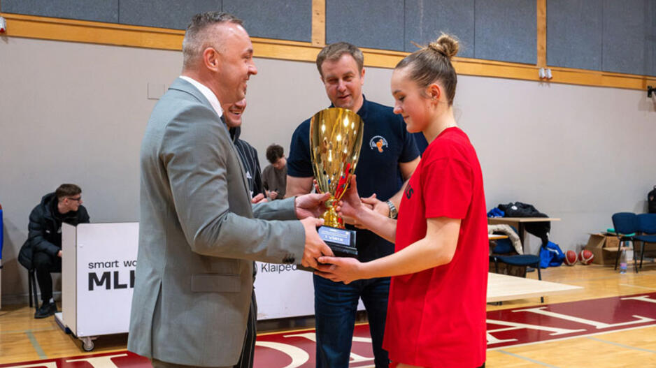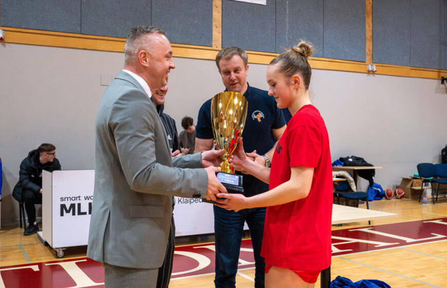 APDOVANOJIMAI. Lietuvos moksleivių krepšinio lygos Merginų U18 B diviziono geriausių komandų apdovanojimai. Viduryje - Klaipėdos krepšinio mokyklos direktorius Laimonas Šapkauskas. Lietuvos moksleivių krepšinio lygos nuotr.