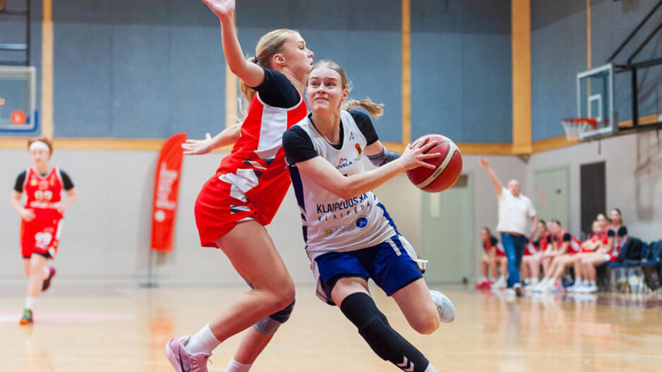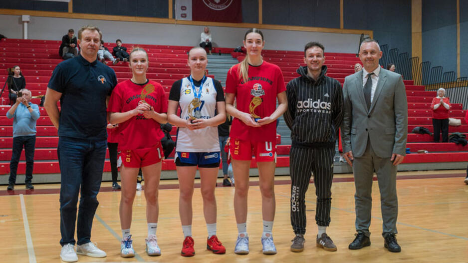 ĮVERTINIMAS. Klaipėdos krepšinio mokyklos jaunoji talentė Augustė Pušinskaitė (trečia iš kairės) - čempionato naudingiausia (MVP) žaidėja. Lietuvos moksleivių krepšinio lygos nuotr.