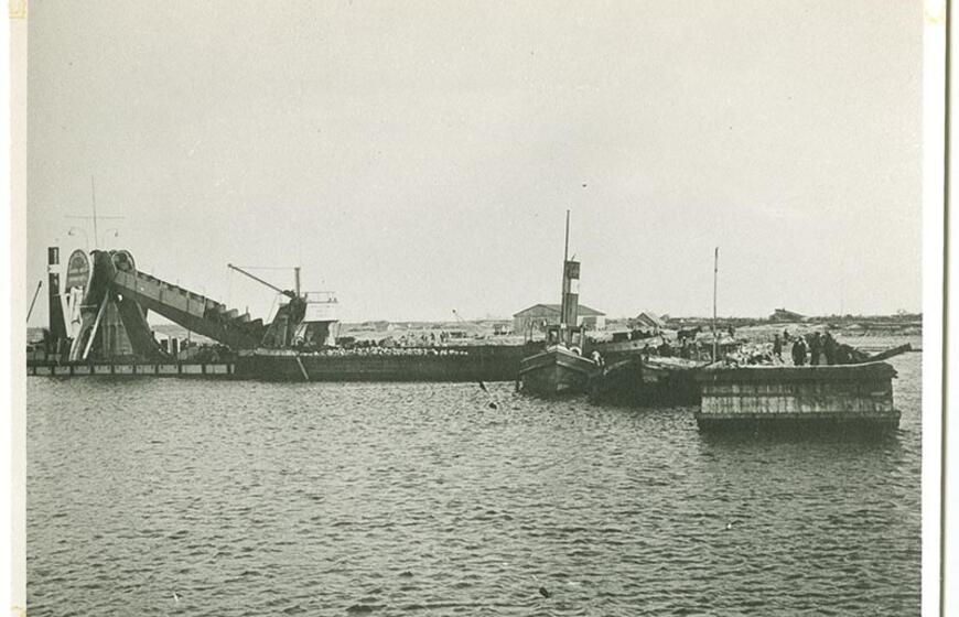 © Britų žemkasė gilina Šventosios uostą, Lietuva, praradusi Klaipėdos kraštą, siekė pastatyti jūrų uostą Šventojoje. 1939-1940 m. Vytauto Didžiojo universitetas.