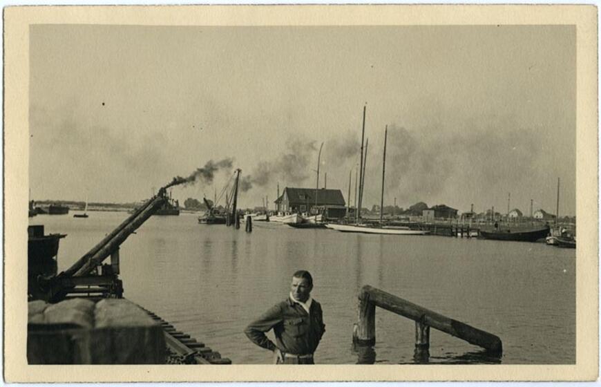 © Šventosios uosto vaizdas. Pirmame plane – sutvirtintos krantinės kampas. Antrajame matyti balti žvejų kuteriai, jachtos, dirbanti žemsemė. Lietuvos jūrų muziejus.