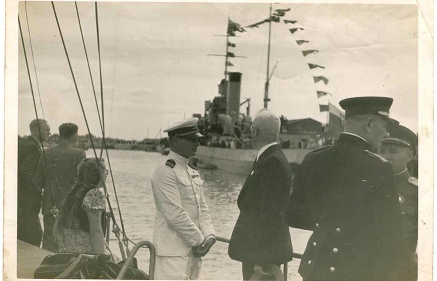 © Šventosios uosto atidarymas 1939 m. Fone - karo laivas „Prezidentas Smetona“.