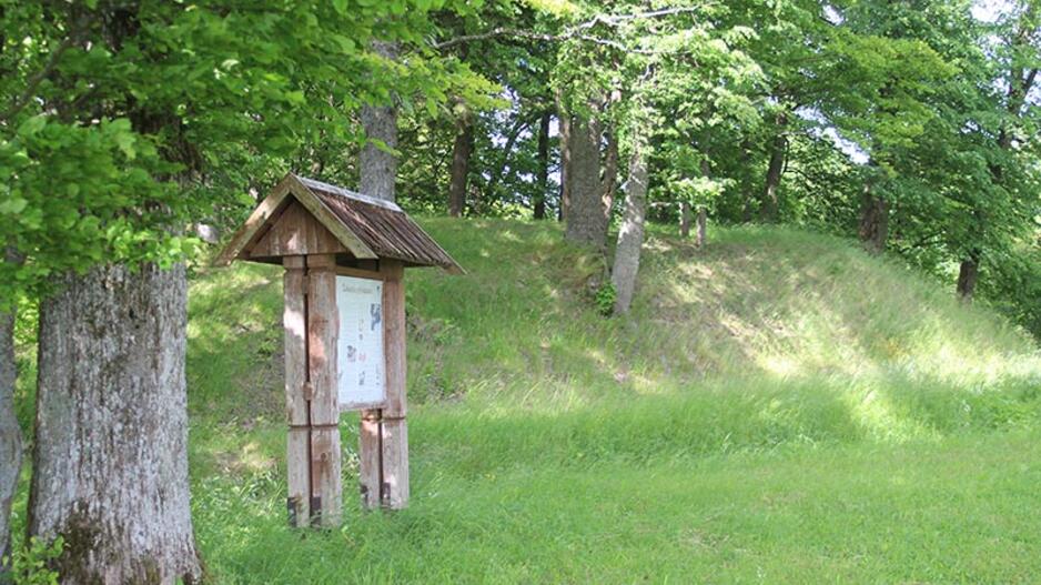 © Toks Lamatos žemės viduramžių medinės pilies modelis pavaizduotas Žakainių piliakalnio (Šilutės r.) informaciniame stende. Deniso NIKITENKOS nuotr.