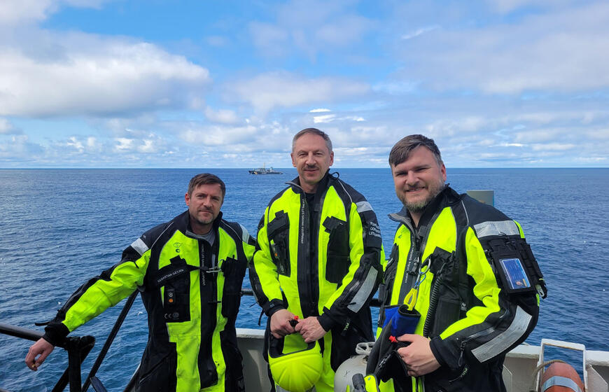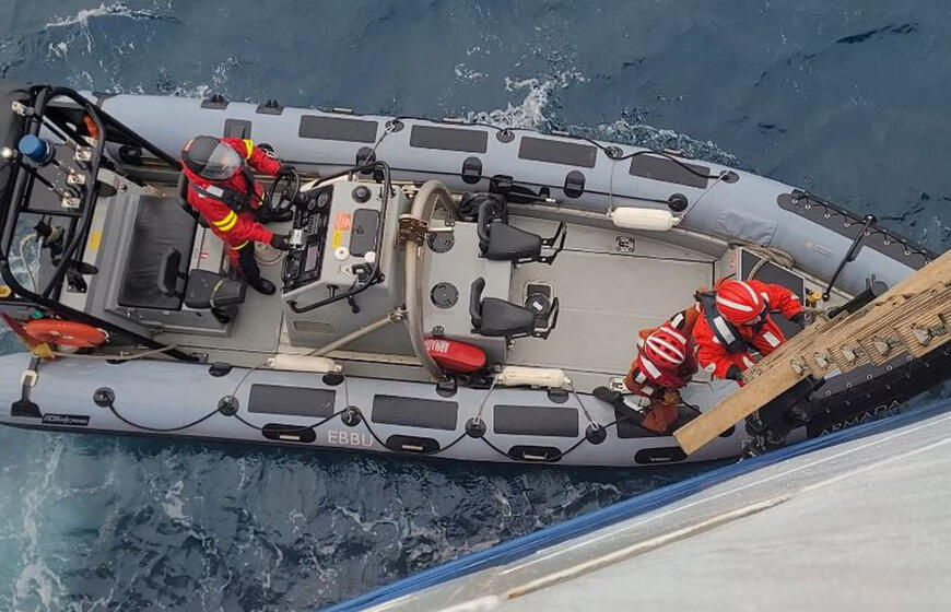 LAIPINIMASIS. Kontrolės pareigūnai ruošiasi lipti į žvejybos laivą.