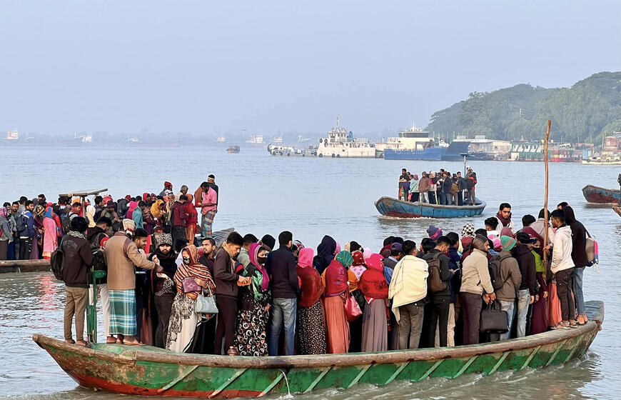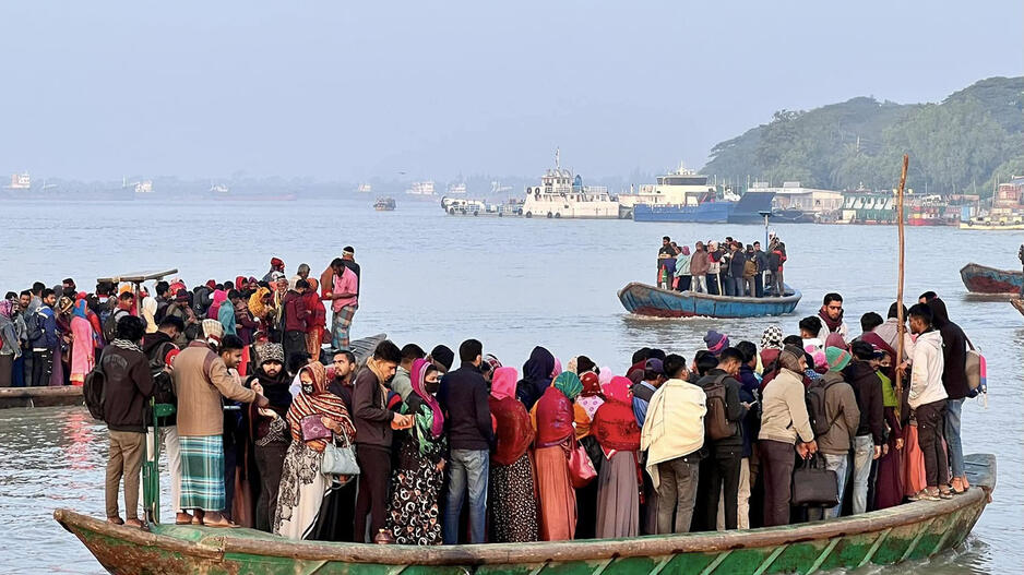 © Eilinės darbo dienos pradžia vienoje iš Bangladešo provincijos gyvenviečių. Žmonės sausakimšomis medinėmis valtimis keliasi į kitą upės pusę, į darbą.
