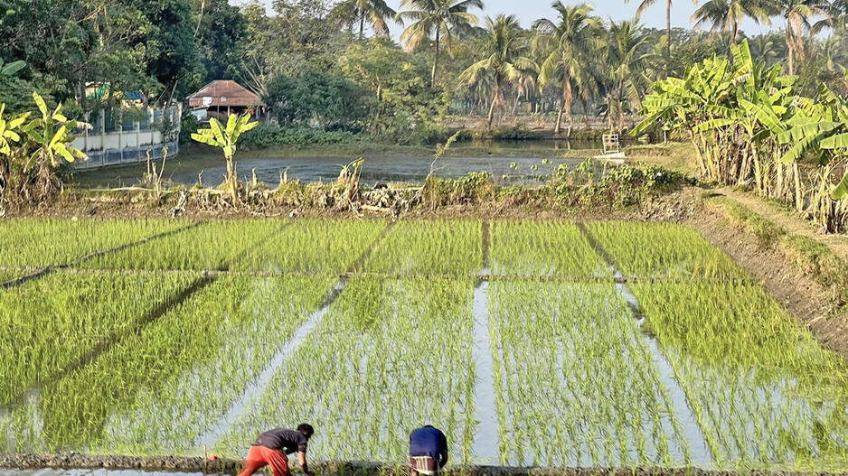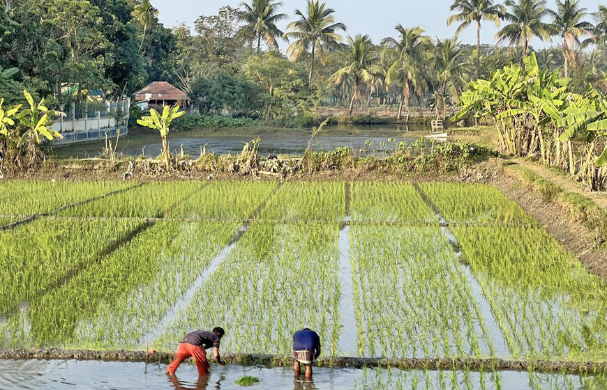 © Įprastas Bangladešo kaimo peizažas - žaliuojantys ryžių laukai, bananai, palmės.