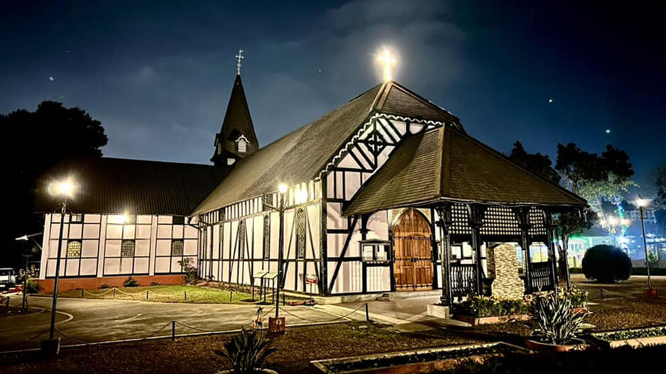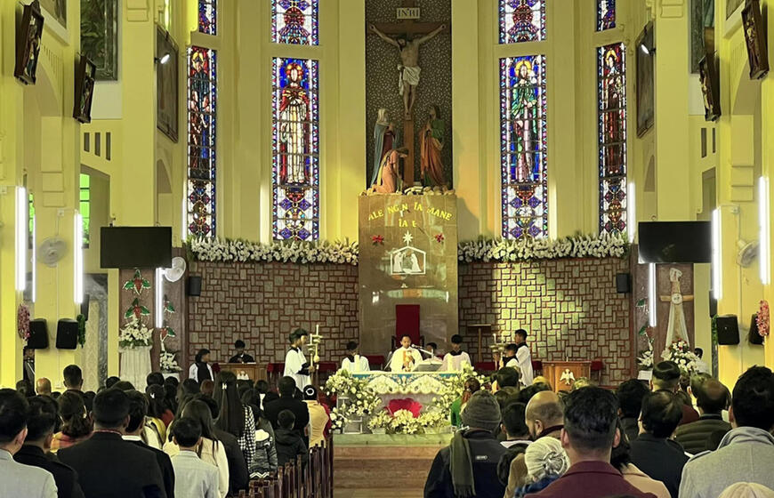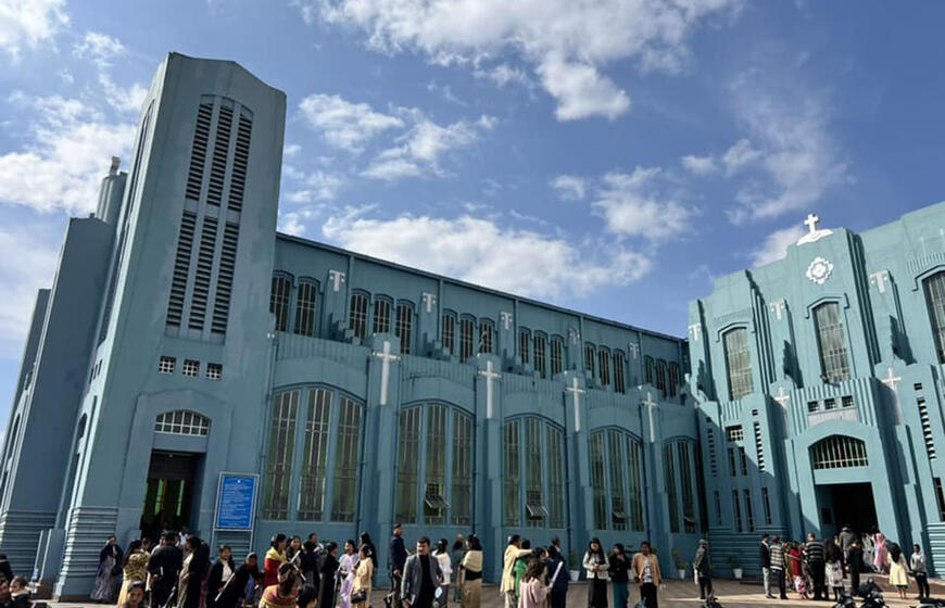 © Marijos Krikščionių Pagalbos katedra - pagrindiniai maldos namai Šilongo mieste. Žmonės būriuojasi aikštėje šalia katedros pasibaigus Mišioms.