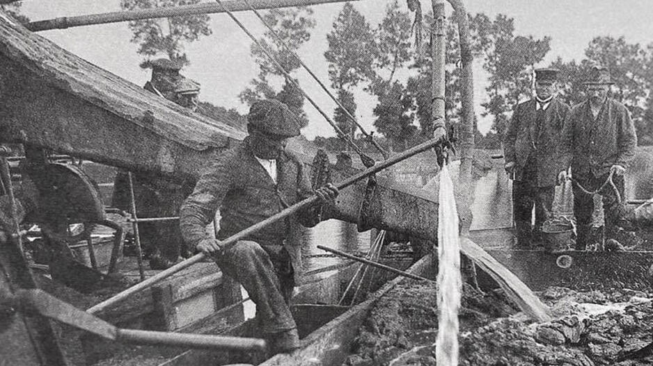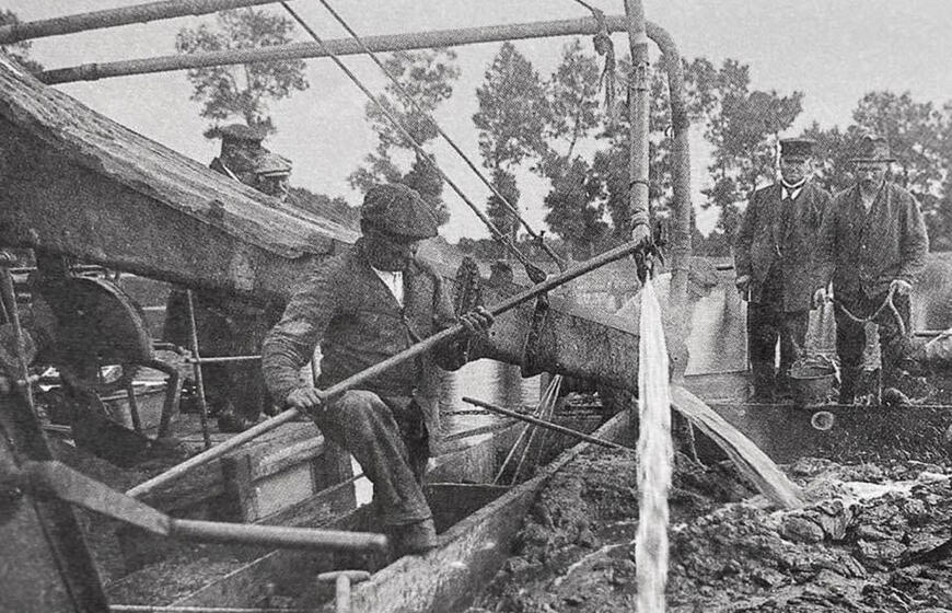 © Iš marių dugno iškastą ir į krantą atplukdytą žemę darbininkai perplaudavo vandens srove ir išrinkdavo gintaro gabalus. Deniso NIKITENKOS archyvas.