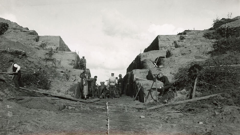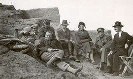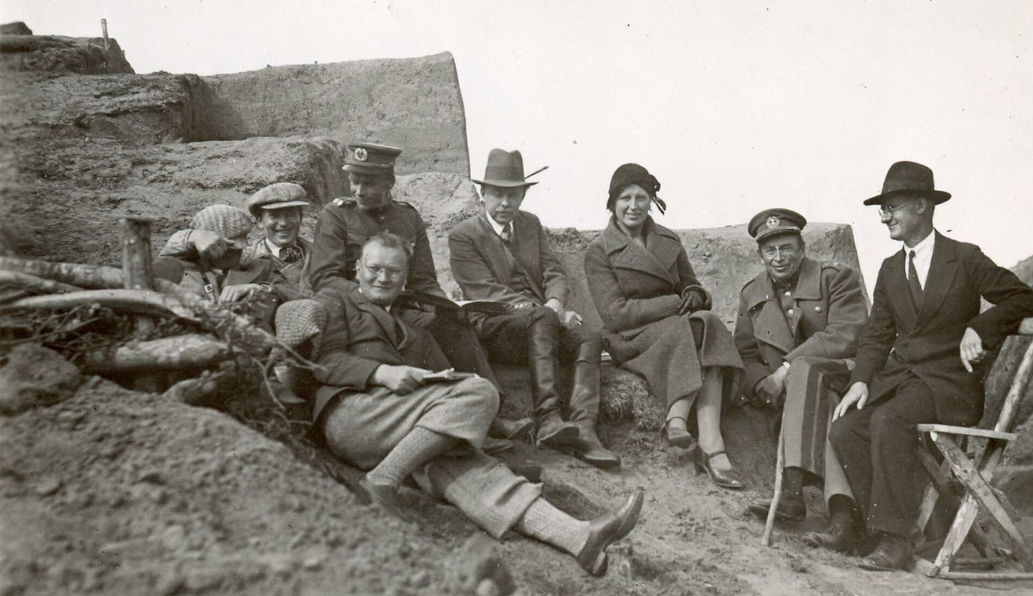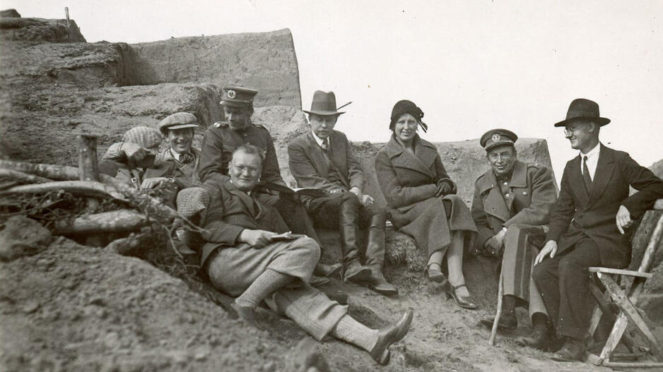 © Istorinė 1933 m. nuotrauka: (iš dešinės) archeologas Balys Tarvydas, kasinėjimų vadovas gen. Vladas Nagius-Nagevičius, premjeras Juozas Tūbelis su žmona. Guli (pirmajame plane) - vienas iš archeologijos mokslo pradininkų Lietuvoje Jonas Puzinas.