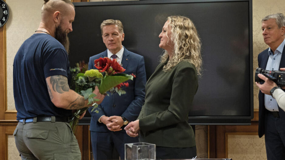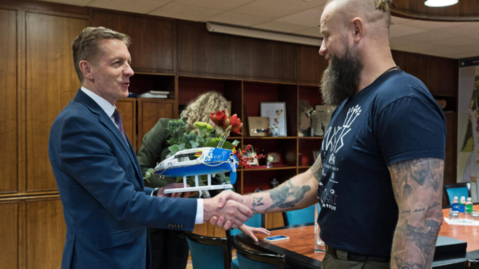 © APDOVANOJIMAS. Aurimui Mockui METŲ ŽMOGAUS apdovanojimą įteikė Klaipėdos miesto meras Arvydas Vaitkus. Vitos JUREVIČIENĖS nuotr.