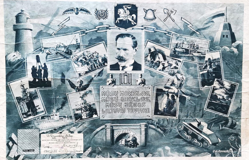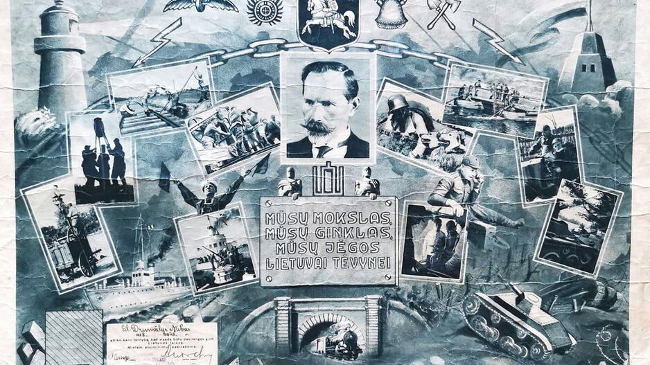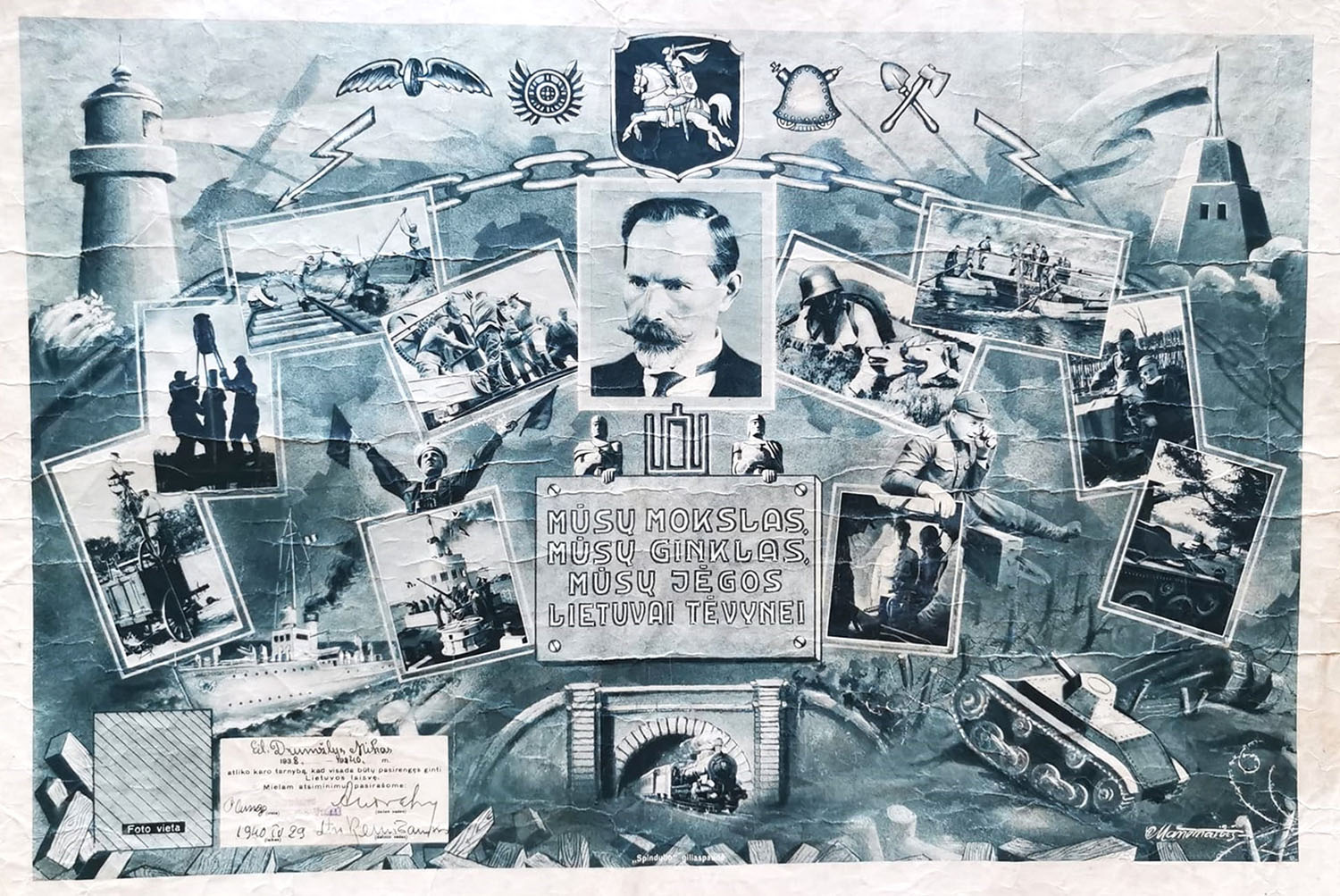 Baltasis švyturys (kairėje) tarpukariu buvo toks pats stiprus simbolis, kaip Vilniaus Gedimino pilis (dešinėje). Taip 1938-1940 m. atrodė proginė, karo tarnybos pabaigtuvių vinjetė.