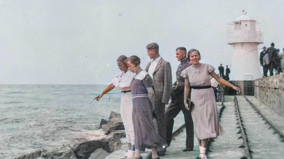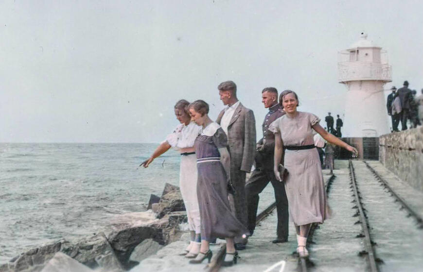 Ypač mylimas miestiečių bei Klaipėdos svečių, Baltasis švyturys buvo tapęs Lietuvos - jūrinės valstybės - ambasadoriumi. DI nuspalvinta nuotrauka pagal juodą baltą originalą, saugomą Lietuvos jūrų muziejuje. Deniso NIKITENKOS asmeninis archyvas.