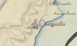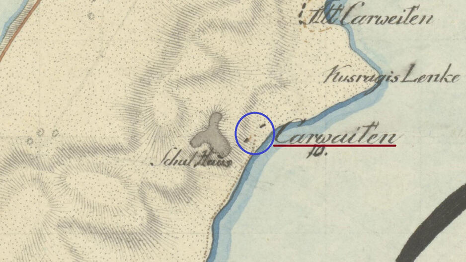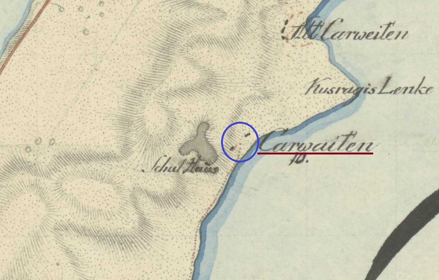 © 1796-1802 m. žemėlapio fragmentas. Iš gimtųjų Liudviko Rėzos Karvaičių (vok. Carwaiten) liko vos kelios sodybos. Kuršių nerijos nacionalinio parko direkcijos archyvas.