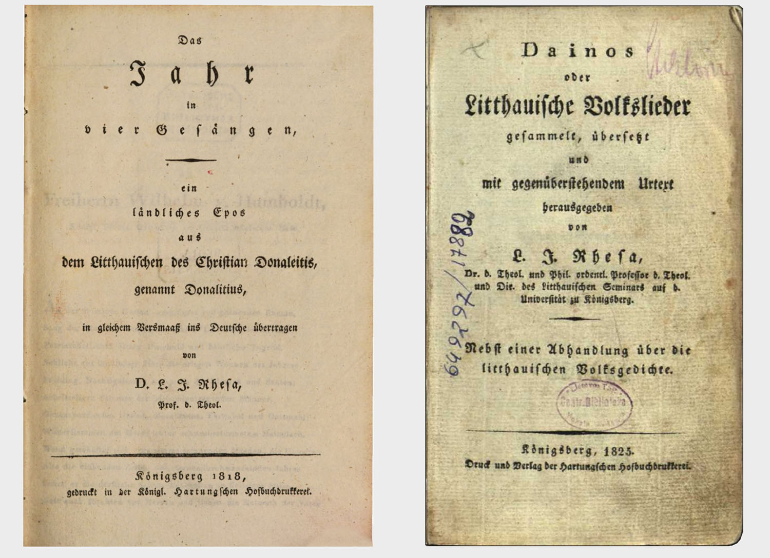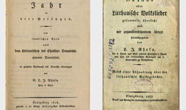 Vieni svarbiausių Liudviko Rėzos darbų: 1818 m. išleistas Kristijono Donelaičio šedevras „Metai“ (kairėje) ir 1825 m. paties parašytas rinkinys „Dainos“. digitale-sammlungen.de