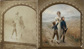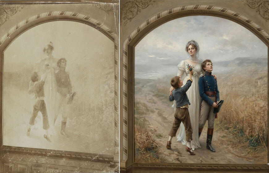 Karalienė Luizė su sūnumis: Friedricho Stahlio paveikslo Klaipėdos naujajame pašte 1893 m. daryta fotonuotrauka (kairėje) ir jos interpretacija pasinaudojus DI. VšĮ Archeologijos centras