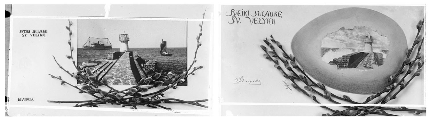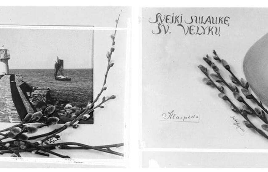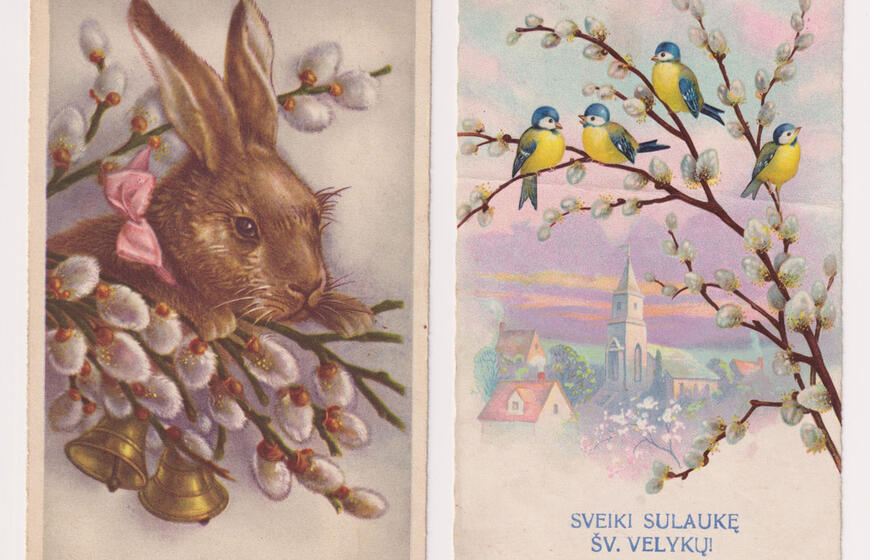 Pavasarinės gėlės, beržų žirginėliai, kiaušiniai... Atgimimo simboliai tarpukario atvirukuose. Kairysis 1938 m. balandžio 15 d. buvo išsiųstas iš Klaipėdos.