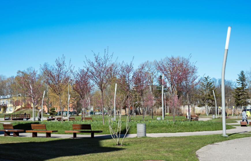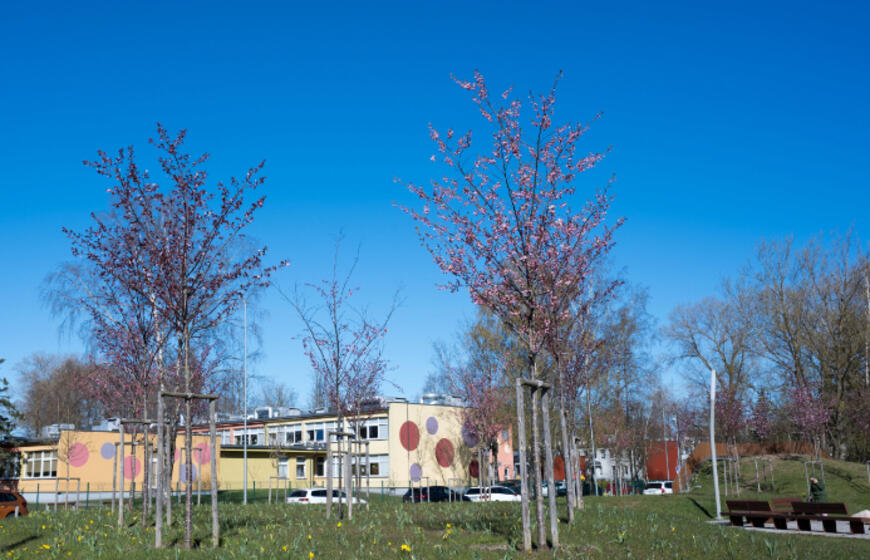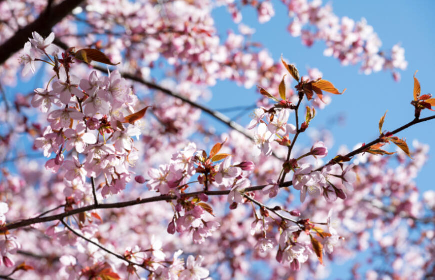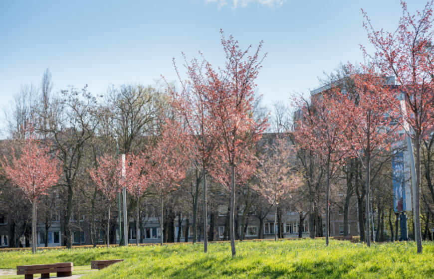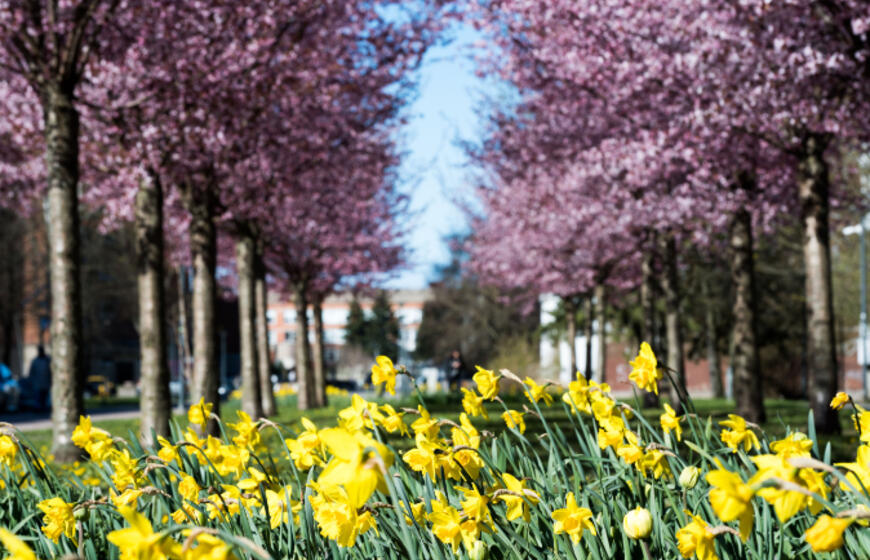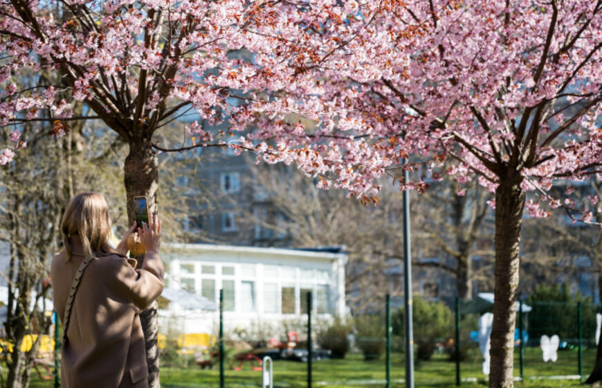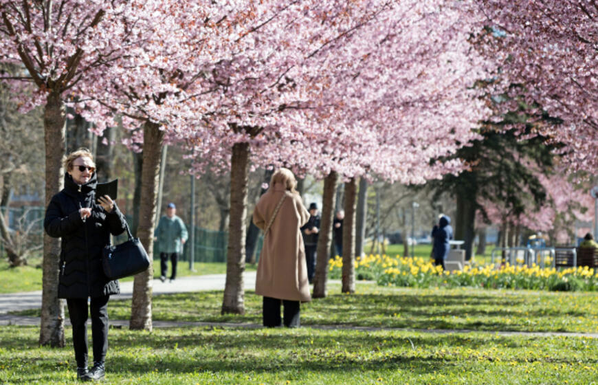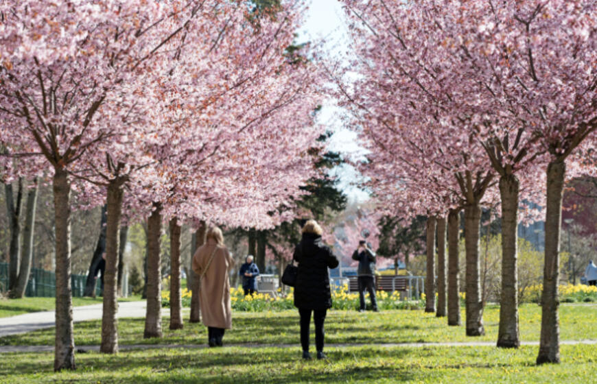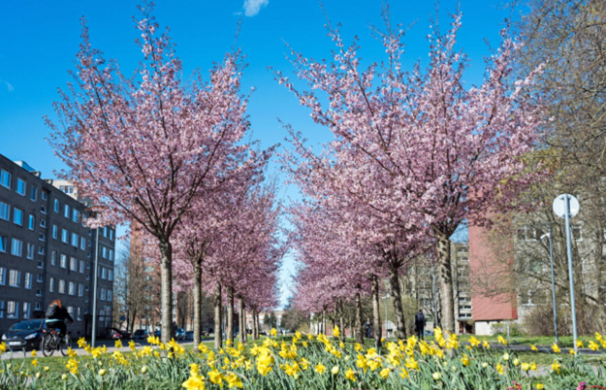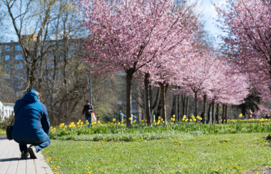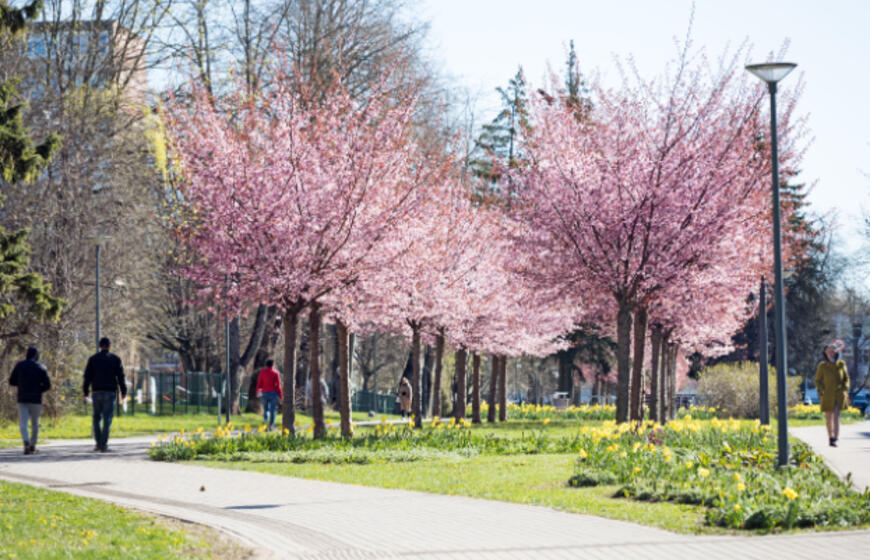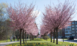 Rožiniai žiedai jau puošia Klaipėdą: pražydo sakuros