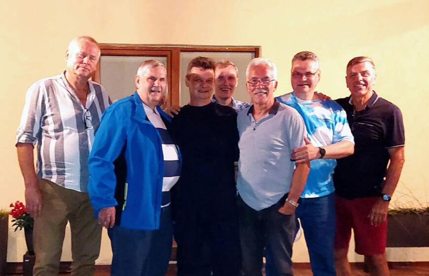 SUSITIKIMAS. Buvę „Kapitono Stulpino“ įgulos nariai Klaipėdoje praėjus 30 metų po įsimintino reiso (iš kairės): jūreivis Alvydas Gečys, Kanados lietuvių bendruomenės pirmininkas Kazimieras Deksnys, virėjo padėjėjas Svajūnas Jokubauskas, elektromechanikas Robertas Valantiejus, jūreivis Valentinas Šemetulskis, virėjas Ričardas Gurauskas, elektrikas Leonardas Stulginskas.