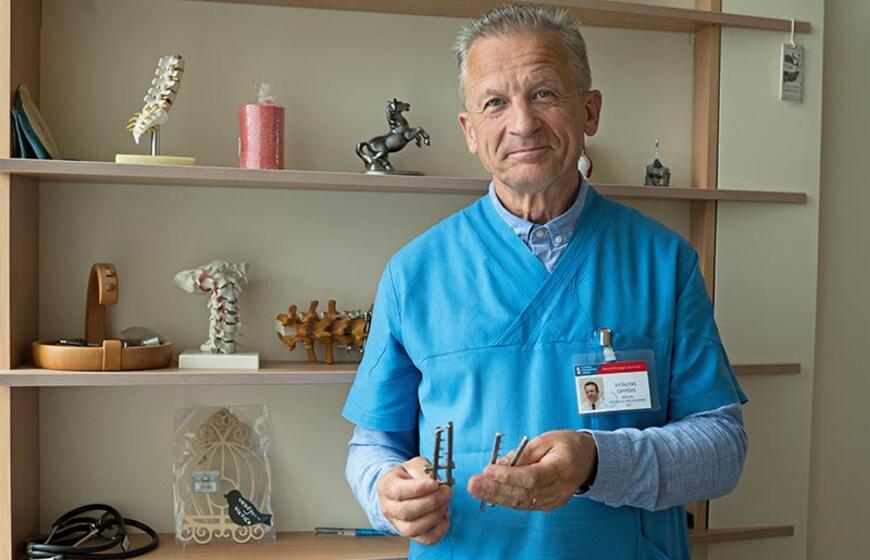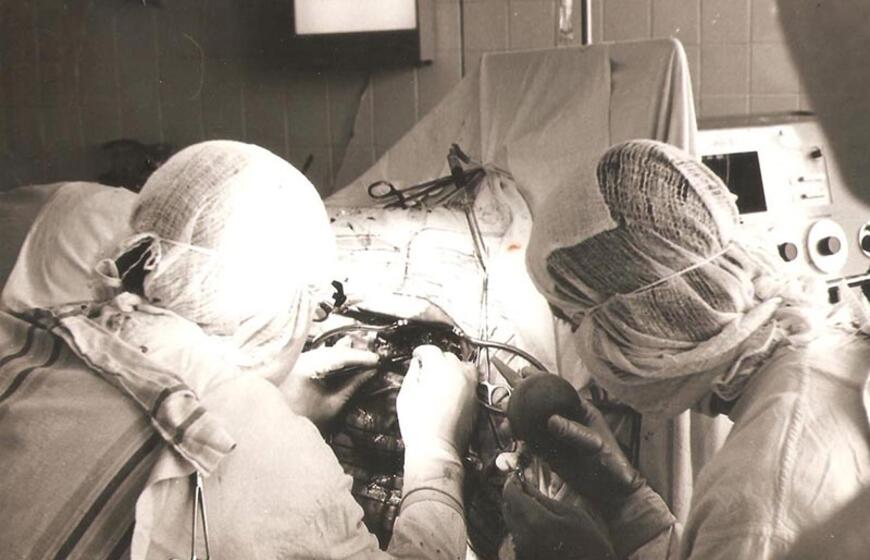 „Taip buvo operuojamas stuburas, nes nebuvo siurblių, irigatorių. Dabar operuojame ligoniui gulint ant pilvo, nes kraujas siurbiamas siurbliais, o tada kraujas bėgdavo į padėtą dubenį. Operacija užtrukdavo ir penkias valandas. Būdavo labai nepatogu sėdėti - pasilenkus, susirietus prie nepatogių operacinių stalų. Nuovargis didžiulis“, - prisiminė V. Grykšas rodydamas šią nuotrauką, kurioje užfiksuotas J. Pakutinskas operacijos metu.