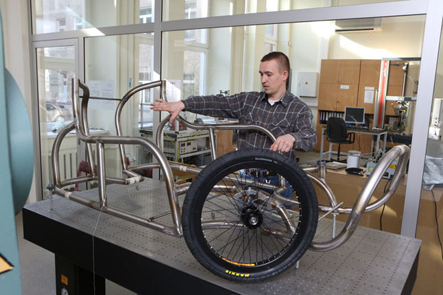 Tada atėjo laikas praktiniam darbui - gamybai. Iššūkių buvo ne vienas. Pavyzdžiui, norint atitinkamu kampu išlenkti nerūdijančio plieno rėmo vamzdžius, teko katedroje esamas senų laikų krumplių frezavimo stakles pritaikyti vamzdžiams lankstyti.