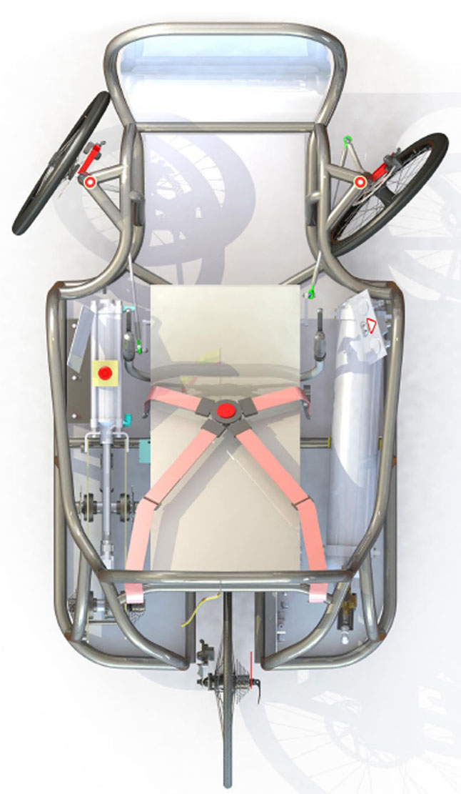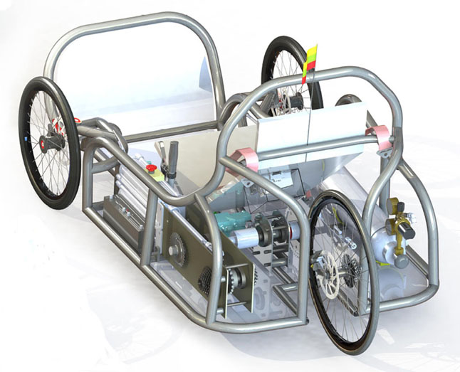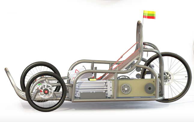 "Bendras principas toks - sukurta transporto priemonė turi būti varoma suspaustu oru, o sukimo momentas į ratus perduodamas pneumatiniais kontrolės ir jėgos perdavimo elementais. Suspausto oro energija paverčiama mechanine energija naudojant "Rexroth" pneumatinius cilindrus ir valdymo sistemą", - pasakojo P. Mažeika.