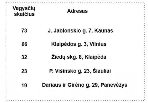 Didžiausių ir pavojingiausių Lietuvos miestų apylinkių penketukas, kuriose buvo įvykdyta 213 vagysčių iš automobilių, tai yra 8,3 proc. visų šiuose miestuose įvykdytų tokio tipo nusikaltimų.