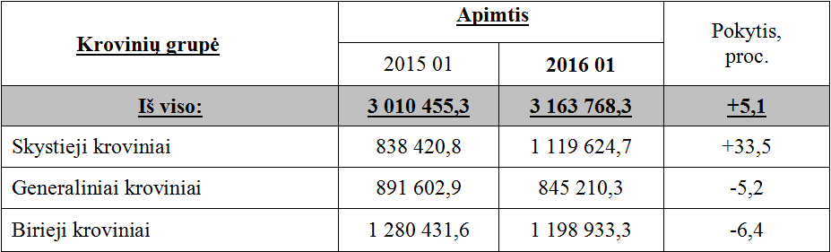 Preliminariais š. m. vasario 3 d. duomenimis, 2016 m. sausio mėn. Klaipėdos uoste krauta 3,16 mln. t krovinių, t. y. 5,1 proc. arba 153,3 tūkst. t daugiau nei 2015 m. sausio mėn.