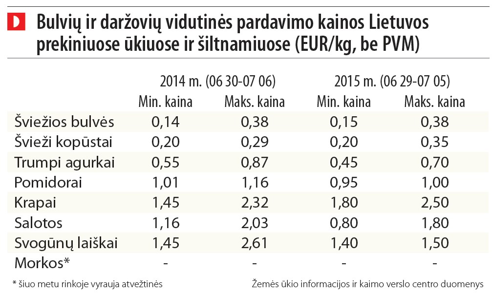 „Vakaro žinios“ domėjosi, kiek kainuoja daržovės šiuo metu Lietuvos prekiniuose ūkiuose ir šiltnamiuose, ir pastebėjo, kad kai kurių daržovių kainos, palyginti su praėjusių metų vasara, netgi krito, pavyzdžiui, 2014 m. liepą ūkiuose kilogramo pomidorų maksimali kaina buvo 1,16 euro, šiemet - 1 euras; trumpų agurkų maksimali kaina buvo apie 0,87 euro, šįmet - 0,70 euro. Vis dėlto turguose tokio pigimo nematyti. Atvirkščiai. Klausėme Lietuvos daržovių augintojų asociacijos direktorės Zofijos Cironkienės, kodėl turguose tokios kosminės daržovių kainos. „Daržovių ir bulvių kainas kelia pardavėjai. Ne paslaptis, kad turgus valdo keli žmonės, o produkciją pardavinėja, išskyrus kelis ūkininkus, jų samdyti pardavėjai, - sakė ji. - Jiems pasakyta, už kokią kainą jie turi pardavinėti. Ir mes turguose pastebėjome, kad kiek praėjusiais metais daržovės kainavo litais, tai dabar eurais. Pavyzdžiui, ankstyvosios bulvės - man žmonės skambina ir klausia, kodėl kai kuriuose rajoniniuose turguose šviežios bulvės kainuoja 1,5 euro už kilogramą.“