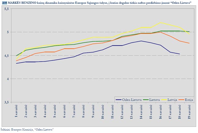 A95 MARKĖS BENZINO kainų dinamika kaimyninėse Europos Sąjungos šalyse, į kurias degalus tiekia naftos perdirbimo įmonė “Orlen Lietuva”
