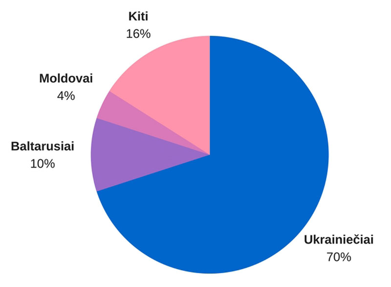 E. Palevičiaus žiniomis, net 70 proc. prašančiųjų leidimo dirbti Klaipėdoje - Ukrainos piliečiai, dar 13 proc. - baltarusiai, 10 proc. - Moldovos, 4 proc. - Rusijos piliečiai. Atvykstančių iš kitų šalių skaičiai ženkliai mažesni. Pavyzdžiui, kinai sudaro tik vieną procentą. Ir pernai, ir užpernai šalių, iš kurių į Klaipėdą atvyko darbuotojai, trejetukas buvo toks pat.