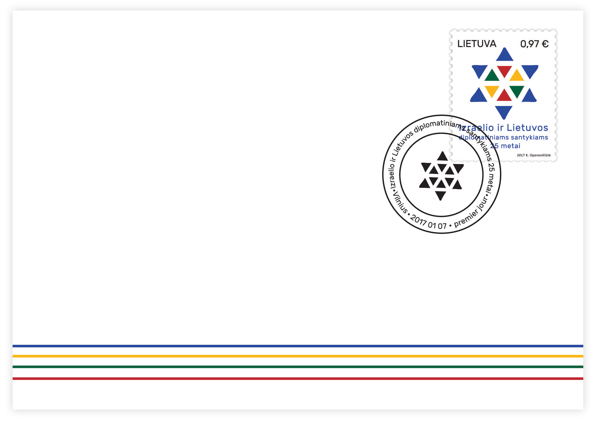 VDA studentės K. Opanovičiūtės sukurtame pašto ženkle panaudotos Lietuvos ir Izraelio valstybių vėliavų spalvos. Pašto ženklo nominalas – 0,97 euro.