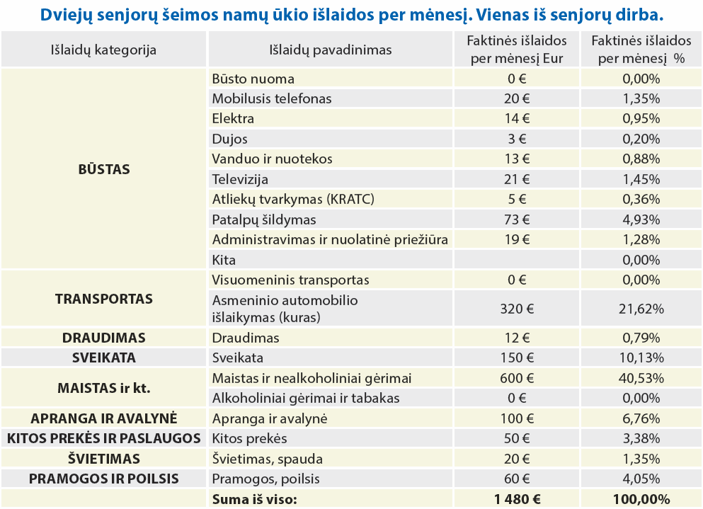 Kitas pavyzdys - senjorų pora, kurioje vienas iš sutuoktinių dar dirba, gyvenanti trijų kambarių bute. Nors ji kas mėnesį vidutiniškai išleidžia 1480 Eur, didžiausią išlaidų dalį taip pat sudaro apsilankymas prekybos centruose (41 proc.). 22 proc. išlaidų tenka lizinguojamam automobiliui išlaikyti, o 10 - vaistams. Pensininkai komunalinėms išlaidoms skiria vos 10 proc. savo išlaidų.