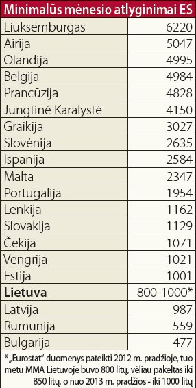Minimalus mėnesio atlyginimas (MMA) Lietuvoje ir kitose Rytų Europos šalyse akivaizdžiai atsilieka nuo Vakarų Europos. Net ir 2013 m. padidinusi MMA nuo 850 iki 1000 litų, Lietuva išliko viena iš paskutiniųjų ES sąraše. Tris kartus didesnį MMA už lietuvių dirbančiuosius yra išsikovoję net graikai, kurių šalis gelbėjama nuo bankroto visos Bendrijos lėšomis (žr. lentelę).